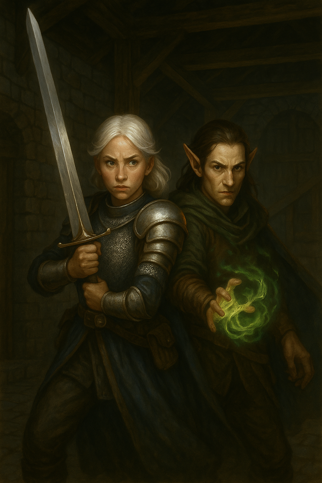 Without our experienced guide, Eostre and Silvyr attempted to infiltrate the hideout on their own. Silvyr’s Wood Elf heritage served him well in the shadows, but Eostre’s chain mail proved… less than stealthy. The clanking metal announced their presence long before they could gain any advantage.