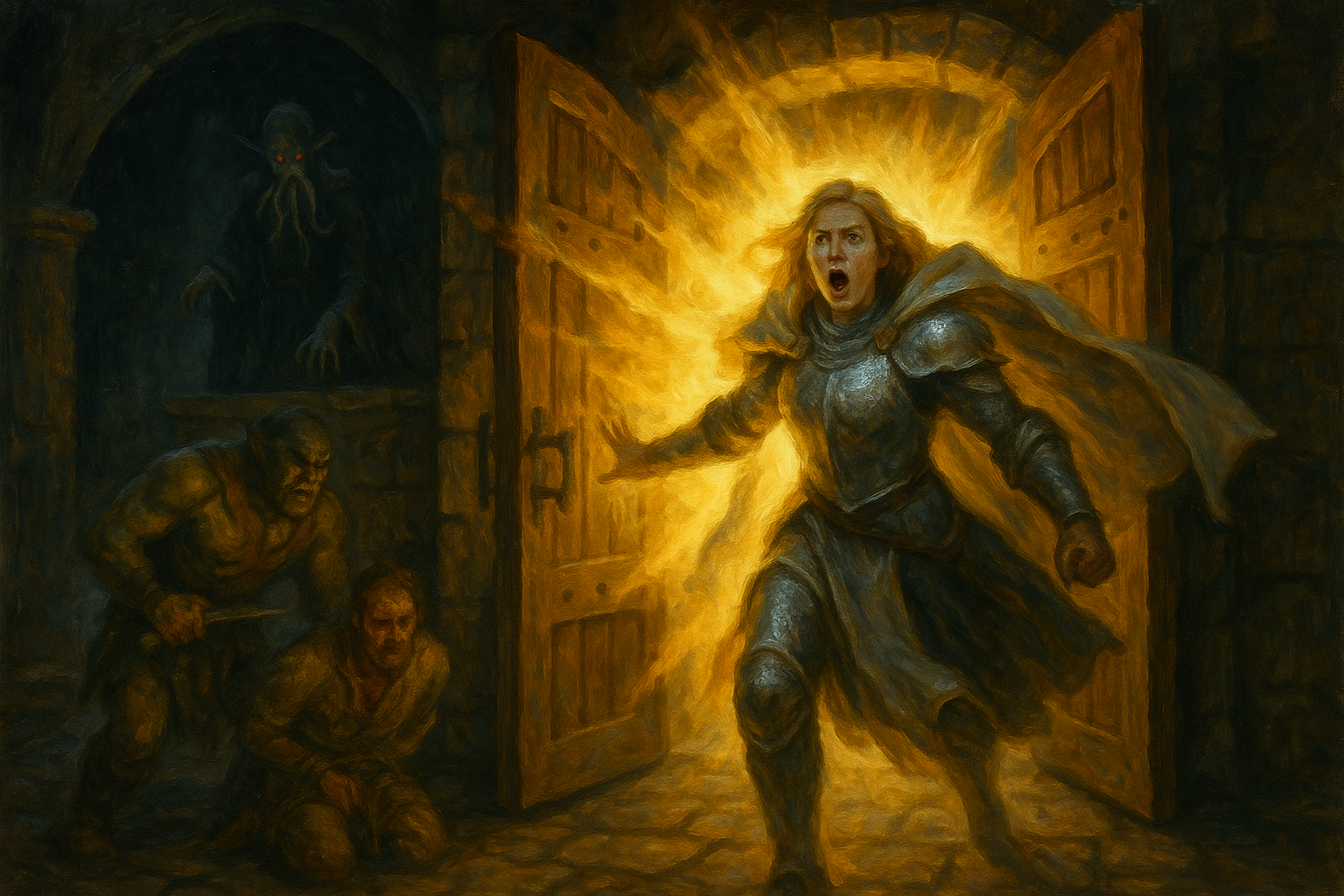 Leave it to Eostre to provide the most memorable moment of our adventure. Seeing the large, ornate doors on one side of the portal chamber, our impatient paladin decided that subtlety was overrated and simply slammed them open.