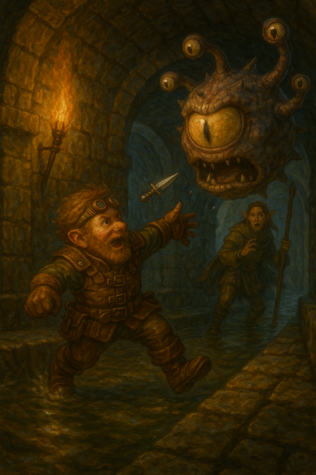 What happened next perfectly demonstrates why I’m so glad Cog is on our side. With one perfectly aimed dagger throw, he struck the gazer with such precision that it dropped immediately. Critical hit, devastating damage, problem solved. The gnome collected his blade and they pressed on as if nothing had happened.