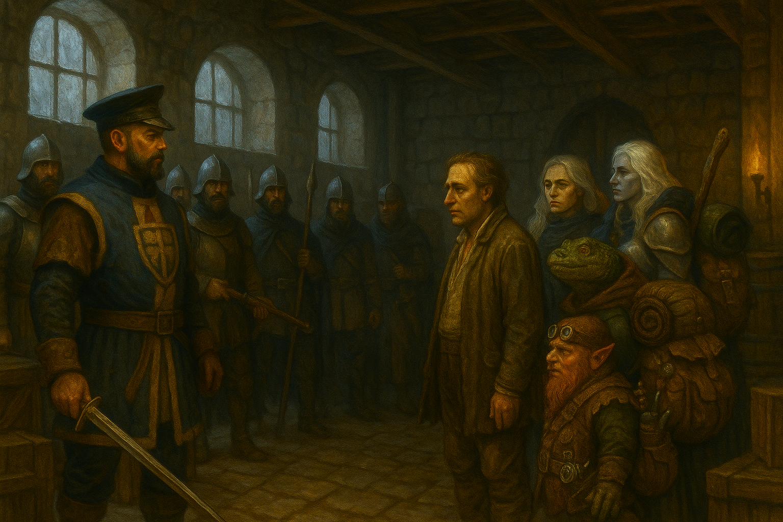 Just as they were preparing to leave the hideout, they heard heavy footsteps above. What they initially feared might be reinforcements turned out to be Captain Staget and a squad of City Watch veterans, drawn by reports of the disturbance.