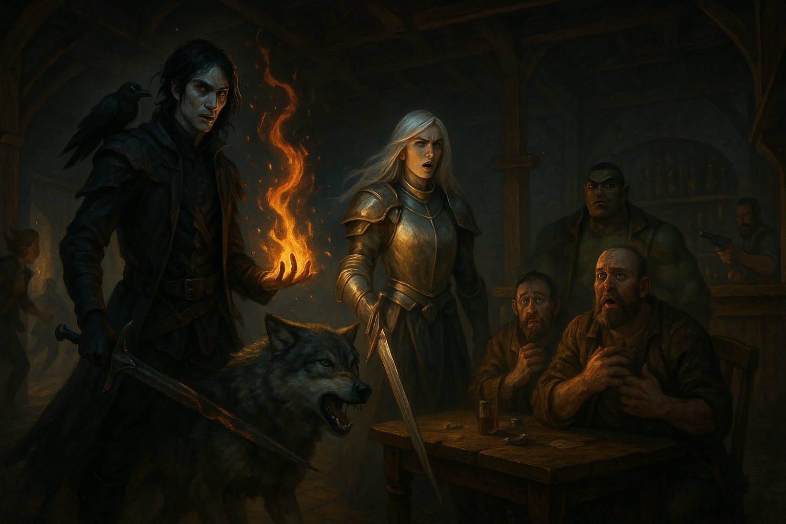 The tavern patrons fled, and the owner pulled a crossbow on the party, blaming them for scaring away his customers. Null managed to salvage the situation with excellent persuasion, convincing the owner they were the good guys on a mission to stop these criminals. The owner retreated upstairs, taking his crossbow with him.