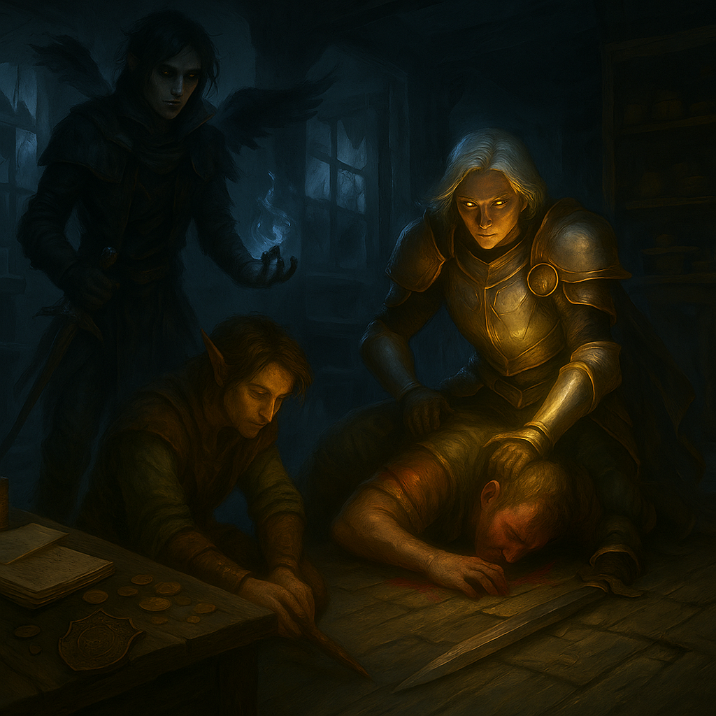 The party returned to the Temple of Tyr to report to Savra, their evidence in hand: Marta’s threatening note, witness statements from both her and Jorik, and confirmation that Tam was definitely being extorted.